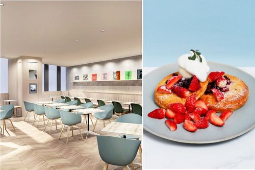 コンテンポラリープランニングセンターが3月6日にリニューアルオープンする書店とカフェを合わせた「カフェ&ブックス ビブリオテーク 東京・有楽町」(千代田区有楽町2-5-1、ルミネ有楽町3階、03-5222-1566)。画像左は店内のイメージ図。右は売りのパンケーキ2枚にレタス8.5個分の食物繊維と、玉ねぎ1.5個分のポリフェノールを摂取できる有楽町店限定の「ギルティーフリー8.5 パンケーキ」(1800円)。