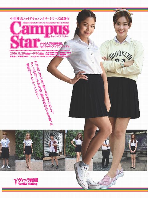 2012年の第1回ヴァニラ画廊大賞で奨励賞を受賞し、2013年、2014年とヴァニラ画廊で個展を開いている写真家の中田柾志(なかた・まさし)さんが今回はタイで出会った制服姿の女子大生たちをキャンパスで撮り下ろしていく中で、女子でも男子でもない「?子」に遭遇し、異性装ともLGBTとも分類できない「?子大生」のカメラの前での爛漫(らんまん)な姿、「限定された制服という括(くく)りの中で、自分が自分であろうとする、その真っ直ぐな性と、生を謳歌(おうか)する姿」を撮り下ろした最新作を展示する。