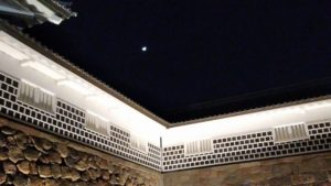 2日目は金管楽器、トランペット2、トロンボーン、ホルン、チューダーの男性4人に紅一点の合奏、ビートルズを2曲やってくれ、下弦の月とライトに青白く浮かび上がった鶴の丸城、夜に舞う蛍、とろけるような吹奏楽による幻想的な野外コンサートに酔いしれた。