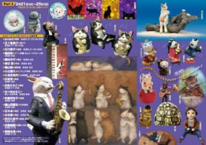粘土、立体作品のなつめみちこさん、絵画の布施和佳子さん、立体造形の細山田匡宏さん、陶芸の正木卓(たかし)さん、陶芸の水谷満さん、絵画、造形の宮内久美子さん、名画を猫化してしまう絵画、立体の目羅健嗣さん、2013年から2018年までにっぽん招き猫100人展で入選している陶芸の柳岡未来さんの19人(組)。