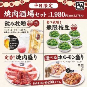 「焼肉酒場」は「焼肉×居酒屋」スタイルを提案しているもので、メニューは「定番焼肉盛り」と「選べるホルモン盛り」に、2時間の飲み放題(生ビールは別途330円追加)、「無限枝豆」として枝豆食べ放題が付いたセットで、1人税込2178円(ラストオーダーは90分)。