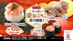 【銀座新聞ニュース=2025年12月25日】コロワイドグループのカッパ・クリエイト(神奈川県横浜市西区みなとみらい2-2-1、ランドマークタワー)が運営する回転寿司チェーンのかっぱ寿司は12月25日から2026年1月14日まで「かっぱ寿司秋葉原万世橋店」(千代田区外神田1-16-1、秋葉原トゥモロービル、03-6206-8600)など全店で「かっぱの豪華かに祭り」を開く。