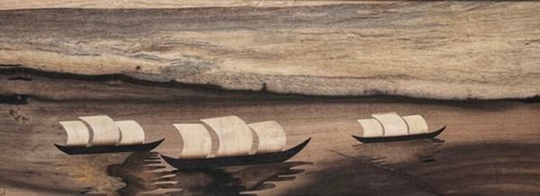 ウイキペディアによると、「木象嵌」はさまざまな色調の木材をはめあわせて絵の板を作り、それをカンナで薄く削り、和紙に貼り付けたものをいう。