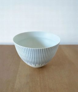 滋賀県大津市で作陶している陶芸家で、愛知県立芸術大学と沖縄県立芸術大学の非常勤講師の澤岡織里部(さわおか・おりべ)さんは生活に役立つ磁器作品を制作している。今回も白磁の素地に刻んだ線に文様を施す「線刻染付」の技法により制作した日常使いの食器や花器、茶器、照明などの小品を中心に展示販売する。