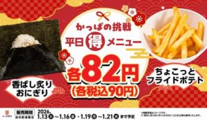コロワイドグループのカッパ・クリエイトが運営する回転寿司チェーンのかっぱ寿司は1月13日から21日まで平日限定で「おにぎり」と「フライドポテト」を税込各90円で提供する。「香ばし炙りおにぎり」(通常160円で22日以降も販売)は特製タレを塗り、直火で炙ることで、外はカリッ、中はふっくらしている。軽い食感の「ちょこっとフライドポテト」は、寿司のお供にも食事の合間にも楽しめるメニューとしている。