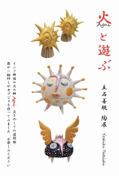 陶芸家の立石善規(よしき)さんがインド神話の火の神「Agni(アグニ)」という「炎を介しての造形物、器や一輪挿しやオブジェ」を制作し、展示する。
