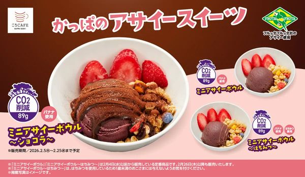 コロワイドグループのカッパ・クリエイトが運営する回転寿司チェーンのかっぱ寿司は2月5日から25日まで全店で「フルッタフルッタ」のアサイーを使用した新たなショコラ味のスイーツ「ミニアサイーボウルーショコラ」(税込360円)を販売。通常のアサイーをベースに、グラノーラ、冷凍イチゴをトッピングした「ミニアサイーボウル」(360円)にショコラの濃厚な風味をプラスした。