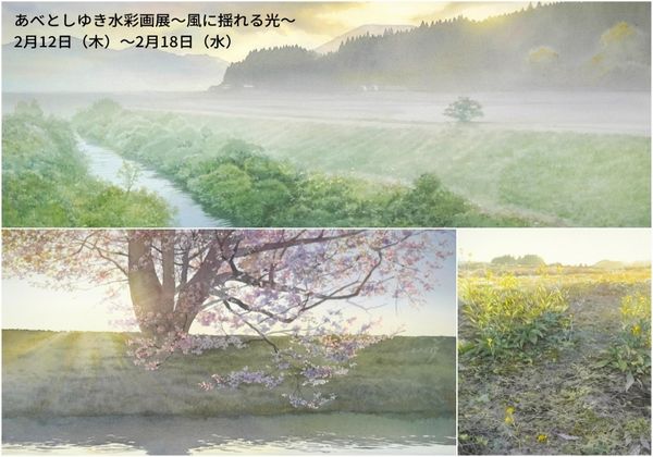 大丸松坂屋百貨店の「Artglorieux GALLERY OF TOKYO(アールグロリュー ギャラリーオブトーキョー)」で2月12日から18日まで開かれるあべとしゆきさんの「水彩画展-風に揺れる光」のフライヤー。