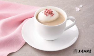 「関山桜のミルク珈琲」は上島珈琲店のミルク珈琲に、関山桜のシロップと和三蜜糖を重ねることで、甘味と香りが調和し、ホイップクリームと、桜の花びらから生まれた「桜クランチ」を添えている。