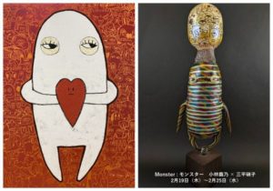 大丸松坂屋百貨店の「Artglorieux GALLERY OF TOKYO(アールグロリュー ギャラリーオブトーキョー)」で2月19日から25日まで開かれる小林繭乃さんと三平硝子さんによる「Monster :モンスター」のフライヤー。