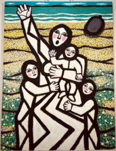 今回は子息の飯塚励生(れお)さんのプロデュースにより、人間愛を強く感じる人物画、ニューヨークの摩天楼シリーズなどの絵画作品、宮沢賢治(1896-1933)の童話「セロ弾きのゴーシュ」(1934年)や童話「銀河鉄道の夜」(1934年)などをテーマに手掛けた10点の版画、また、平和を願い追求した戦争・難民・飢えをモチーフにした作品を選んで約70点を展示販売する。