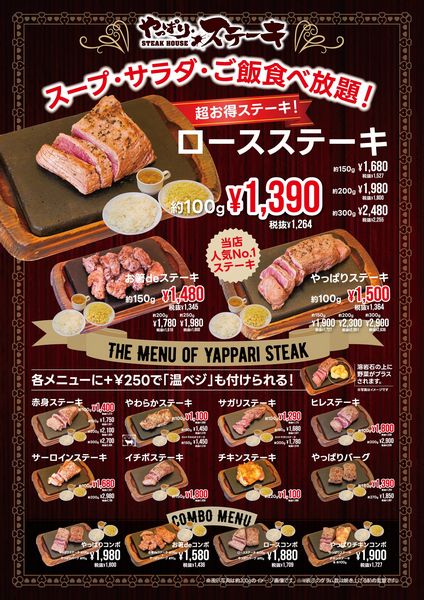 ディーズプランニング(東京オフィス・港区東新橋2-18-3、ルネパルティーレ汐留707、03-6402-5129)は「やっぱりステーキ神田店」(千代田区鍛冶町2-3-14、03-6285-2919)など全国の「やっぱりステーキ」で、3月2日から主力のロースステーキの価格を最大320円値下げする(画像)。主力の「やっぱりステーキ(ロースステーキ)」(サラダ・スープ・ご飯セット)は現在、100グラムが税込1500円、150グラムが1900円、200グラムが2300円だが、3月2日から100グラムを110円引きの1390円、150グラムを220円引きの1680円に、200グラムを320円引きの1980円にする。また、「やっぱりステーキ(ミスジ)」は1500円を据え置く。