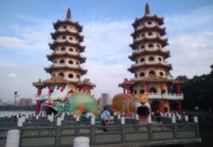 高雄の龍虎塔。入口に龍虎の像が控え、極彩色の7重の塔の最上階からは、人工湖の蓮池潭のパノラマが見渡せる。