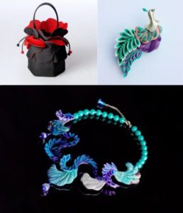 着物アクセサリーのデザイナー、「cofu(コフ)」ブランドで活動する街風(つむじ)奈緒子さんが日本の卓越した染色技術の誇り「着物」、その美しさに魅せられて、さまざまな時代の着物を、身に纏うARTとして、アクセサリーとして、ネックレス、ブローチ、かんざし、帯留めなどに蘇らせた作品を展示販売する。