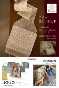 和文化コンシェルジュの古谷(ふるや)尚子さんの企画で、「アバカ(糸芭蕉)」という、「その白き輝きとマクラメ編みによって創り出される繊細な模様」のバッグ類を展示販売する。フィリピン中西部パナイ島マリナオ村の職人たちの手仕事としている。