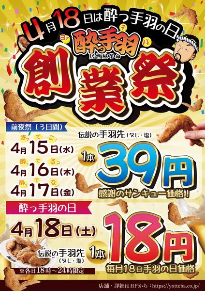 4月15日から17日の18時から24時は前夜祭として「伝説の手羽先(タレ・塩)」が「感謝のサンキュー価格」で1本39円(通常価格3本で税込319円、5本で429円)、18日は創業日にちなみ「酔っ手羽の日」とし、18時から24時まで「伝説の手羽先(タレ・塩)」1本18円で提供する。